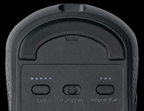 Внутри установлен флагманский сенсор PixArt 3395 с DPI до 26 000 и IPS 650. Мышка поддерживает частоту опроса до 4000 Гц. Под кнопками можно увидеть микрики Huano 80M с ресурсом 80 млн нажатий. Помимо двух основных кнопок и колёсика прокрутки есть парочка боковых клавиш. На нижней части расположена кнопка для переключения режимов DPI.