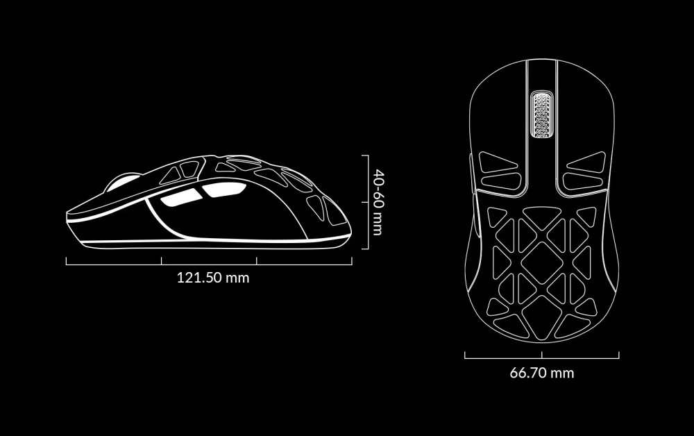Девайс премиум-класса получил корпус из магниевого сплава с перфорацией. Вес «грызуна» — 64 г. Размеры можно увидеть на изображении: