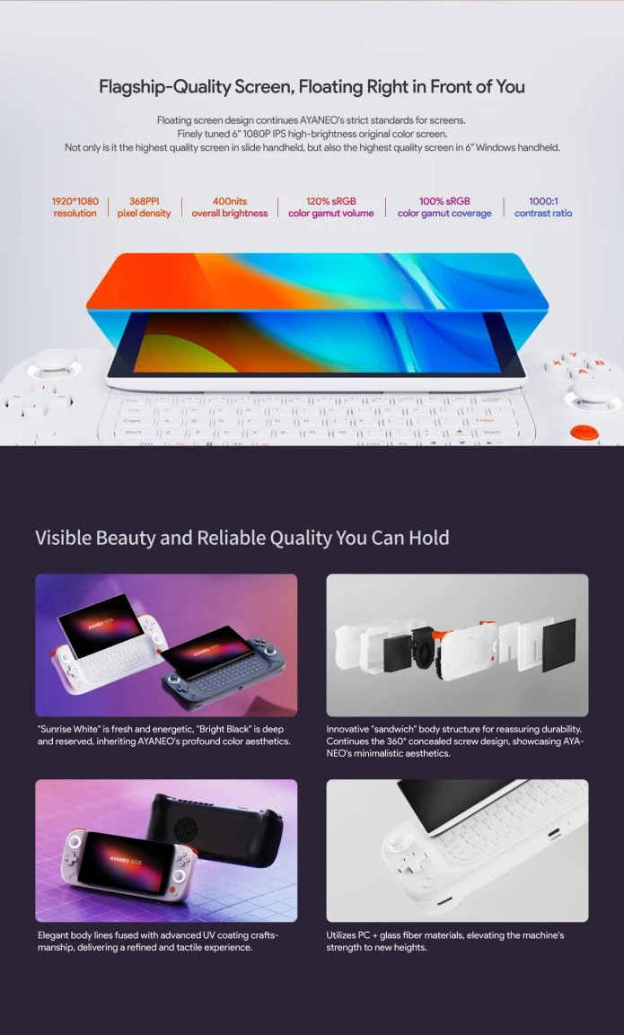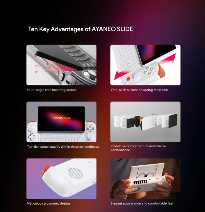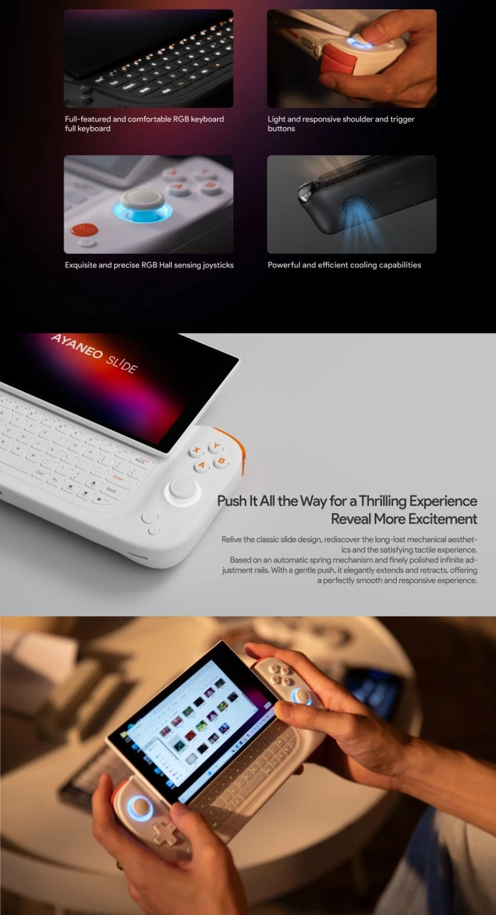 Под 6-дюймовым экраном Ayaneo Slide находится физическая клавиатура. В качестве дисплея используется панель IPS с разрешением 1080p и яркостью 400 нит. По органам управления всё привычно: набор кнопок, крестовина, триггеры и стики с датчиками Холла. Консоль выйдет в двух цветах: чёрном и белом. Вокруг стиков есть подсветка. Клавиши клавиатуры тоже подсвечиваются.
