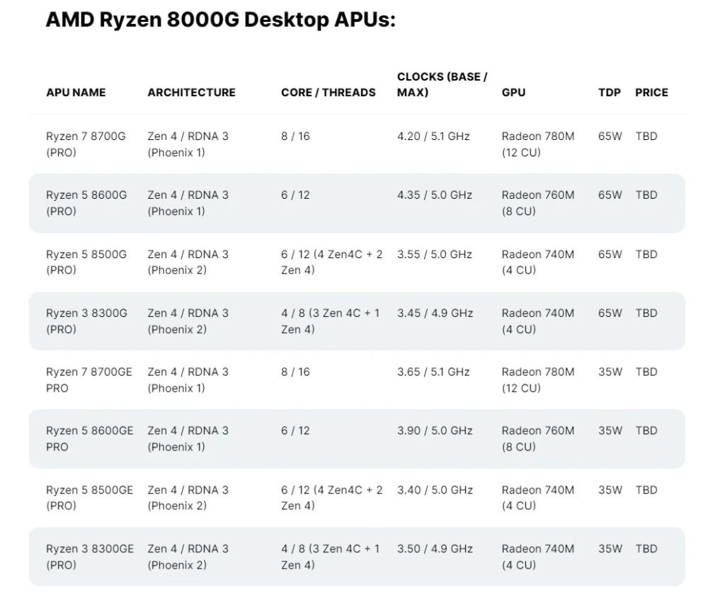 В списке также указаны Ryzen 8000G с приставкой GE в названии. У них ниже базовая частота и TDP всего 35 Вт. По ядрам и потокам разницы нет, как и по GPU.
