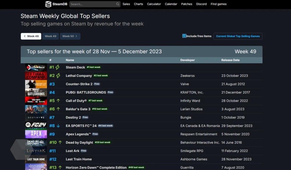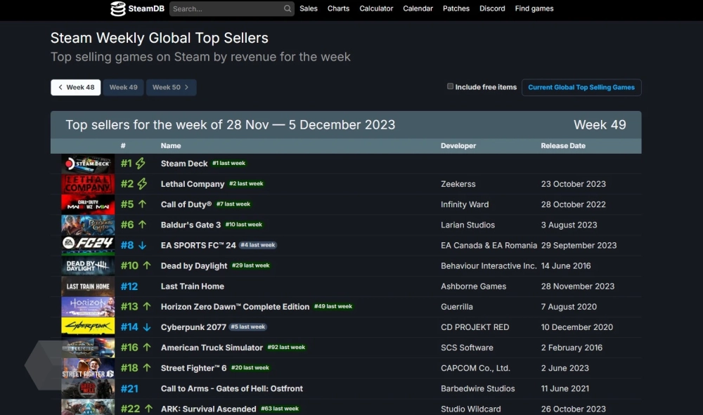 В свежем чарте магазина Steam за прошедшую неделю лидеры не поменялись. На первом месте портативный ПК Steam Deck, а на втором инди-хоррор Lethal Company.