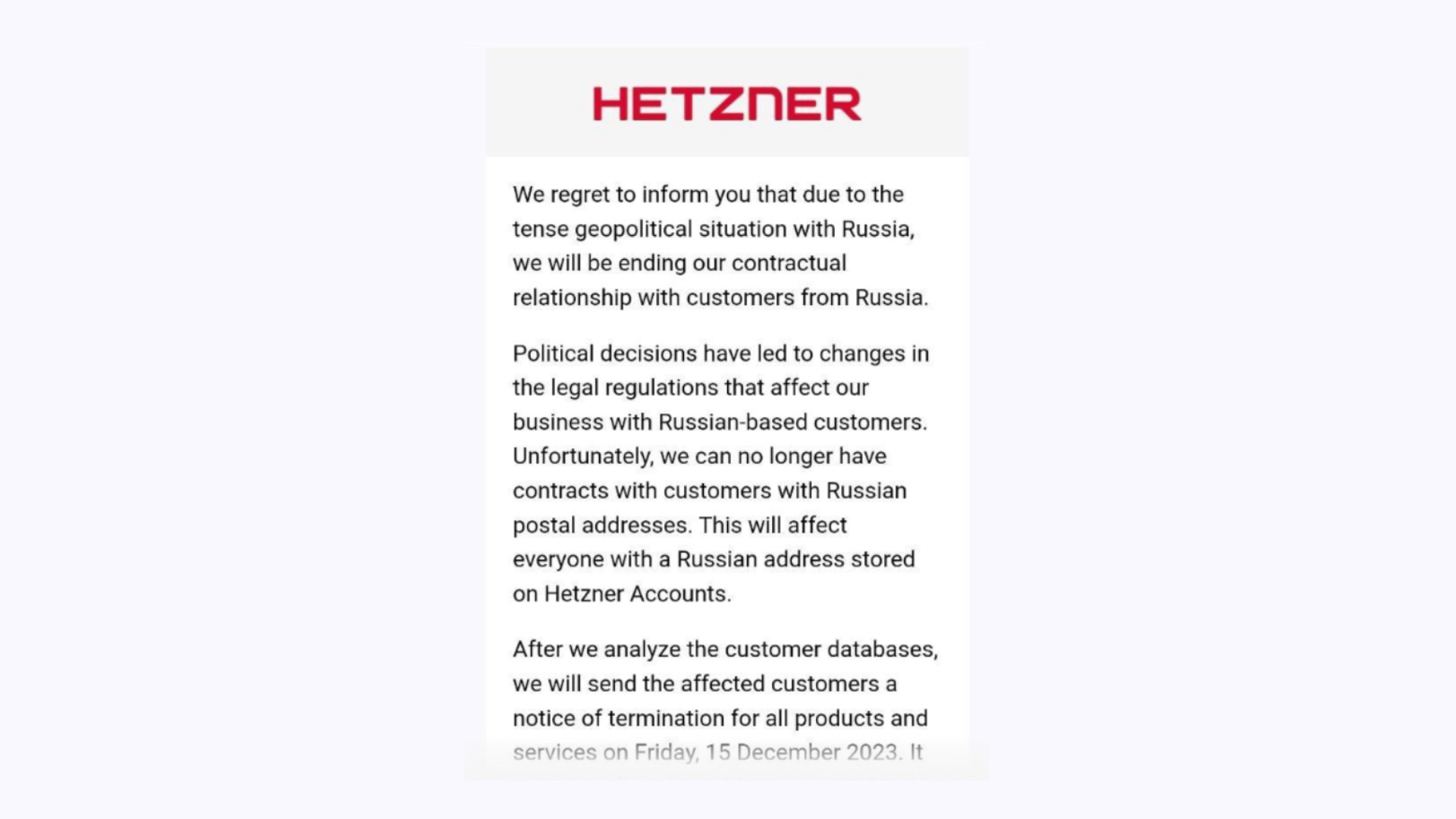 «С сожалением сообщаем вам, что из-за напряжённой геополитической ситуации мы прекращаем договорные отношения с клиентами из России. Политические решения привели к изменениям в правовых нормах, которые влияют на наши отношения с российскими клиентами», — из письма Hetzner