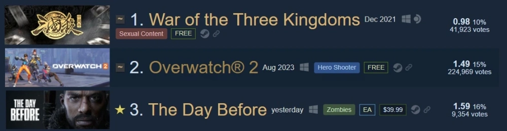 По версии Steam250, сейчас The Day Before находится на седьмой строчке топ-10 с рейтингом одобрения 18%.