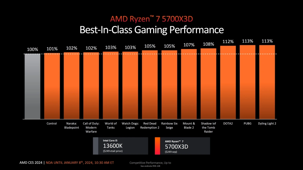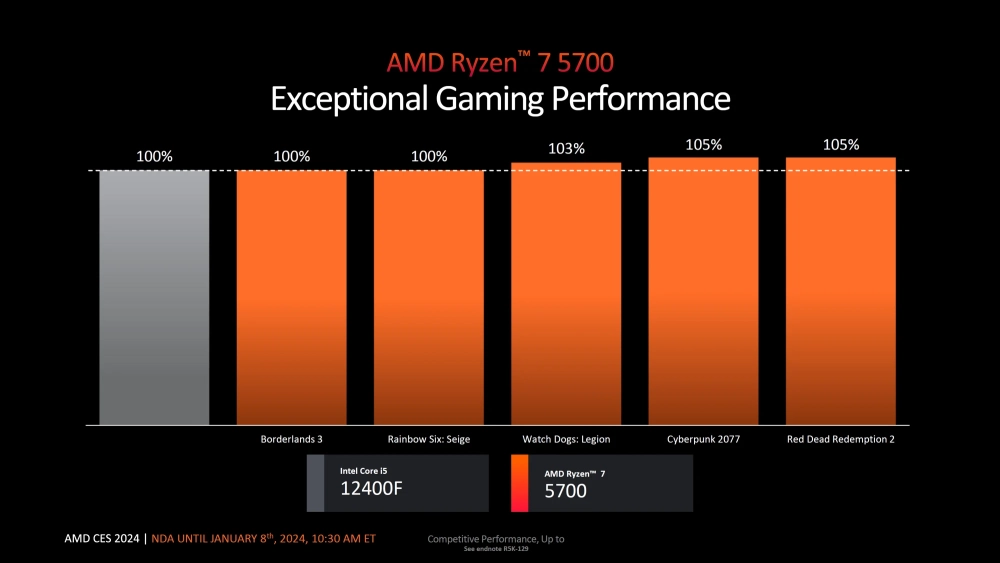 Ryzen 7 5700 представляет собой ещё один 8-ядерным процессор, но без 3D V-Cache. Частота достигает 4,6 ГГц. Кэш — 20 МБ. TDP — 65 Вт. Процессор выйдет по цене 175 долларов (~15 900 рублей).