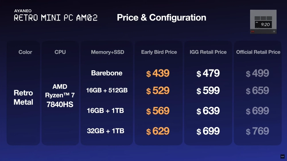 Все версии AM02 будут поставляться в корпусе с объёмом 0,9 литра и процессором AMD Ryzen 7 7840HS. Отличается только количество оперативной памяти и объём накопителя.