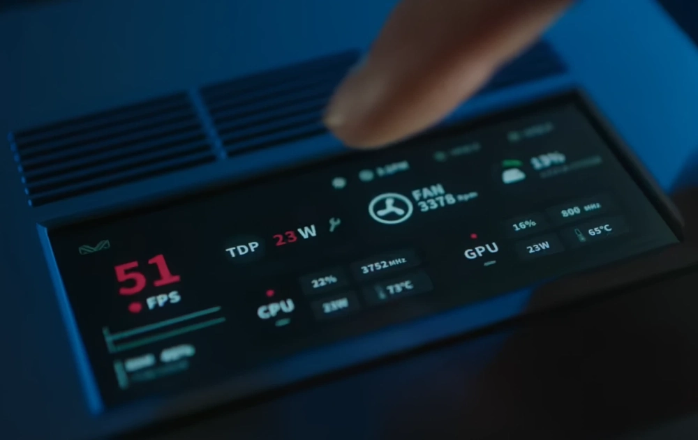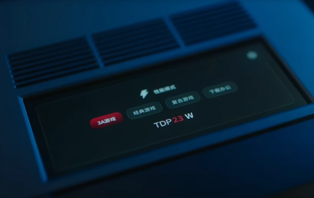 У AM02, помимо дизайна в стиле приставки NES, имеется ещё одна особенность — 4-дюймовый сенсорный экран на верхней части корпуса. На него получится вывести время или анимации. Кроме того, прямо с дисплея можно выбрать режим TDP, отрегулировать громкость в системе и задать другие настройки.