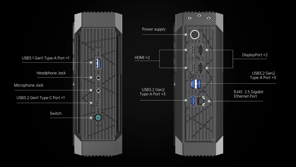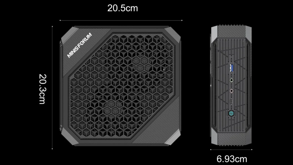 Из внешних портов у мини-ПК есть USB Type-A, Type-C, DisplayPort, HDMI, RJ45 и 3,5 мм. Размеры компьютера: 205×203×69 мм.