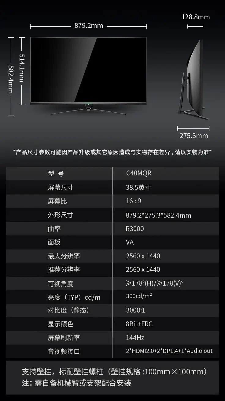 Titan Army C40MQR поставляется с 38,5-дюймовой матрицей. Соотношение сторон — 16:9. Разрешение — 2560×1440 пикселей. Частота обновления — 144 Гц. Кривизна экрана — 3000R. Используется матрица VA (8 бит+FRC) со временем отклика 1 мс.