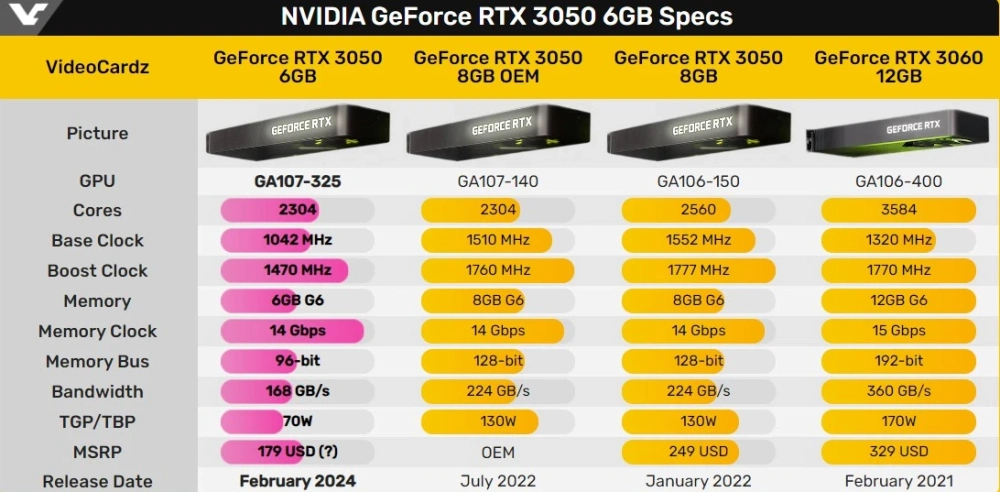 Карта получила не только меньше памяти в сравнении с RTX 3050 8 ГБ. Ещё у неё 96-битная шина вместо 128-битной. Используется GPU GA107-325 с 2304 CUDA-ядрами. TDP — 70 Вт. Видеокарта не требует подачи дополнительного питания.