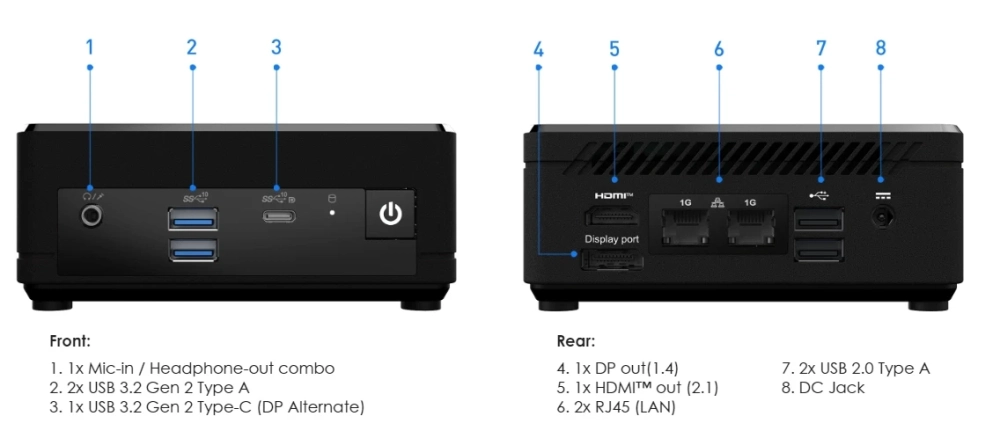 MSI Cubi N ADL получил порты DisplayPort, HDMI и USB Type-C. Через каждый из них можно вывести картинку в разрешении 4K. Также есть два сетевых порта. Все компьютеры Cubi N проходят испытания на надёжность и имеют аппаратную поддержку TPM 2.0.