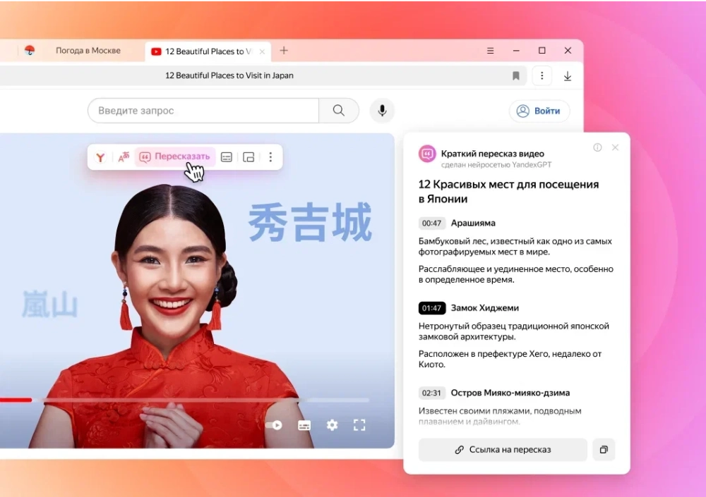 - Функция пересказа иностранных видео с помощью YandexGPT. ИИ сделает краткий пересказ на русском и озвучит его.