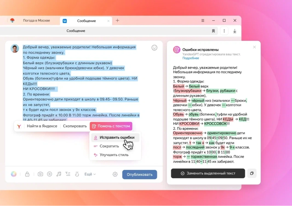 - Функция редактирования «Помочь с текстом» на основе YandexGPT. Она работает в трёх режимах: «Исправить ошибки», «Сократить» и «Улучшить стиль».
