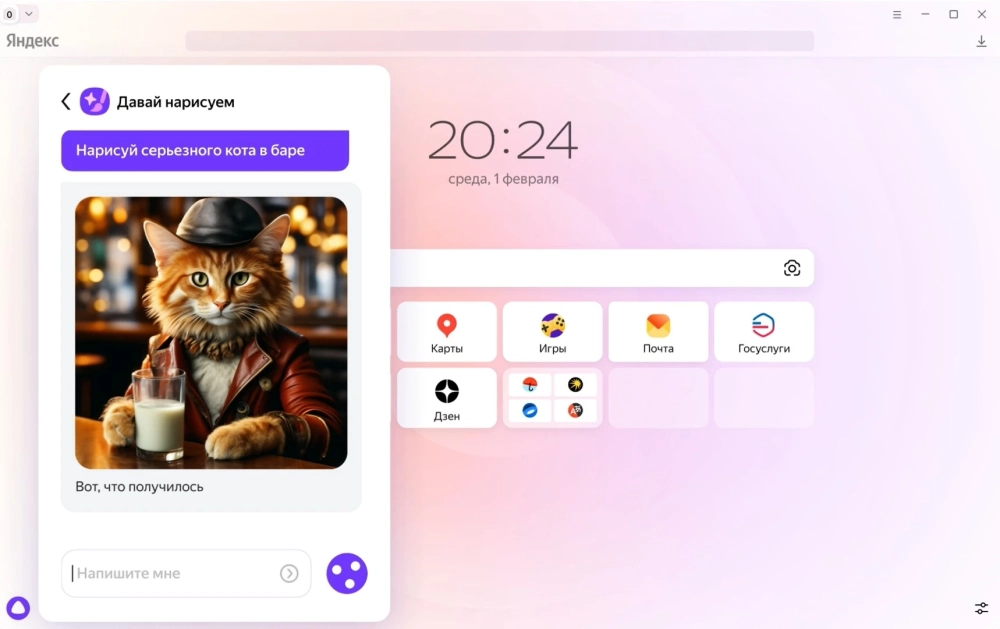 - «Давай нарисуем» — функция, которая позволяет создавать изображения с помощью нейросети YandexART. Нужно обратиться к «Алисе» и текстом или голосом описать, что нужно сгенерировать.