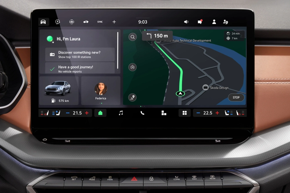 В базе у автомобиля 10-дюймовая цифровая приборная панель и мультимедиа-тачскрин аналогичного размера. За дополнительные деньги доступен 13-дюймовый центральный экран. Skoda обещает дополнить фирменный голосовой ассистент Laura интеграцией с ChatGPT: помощник сможет давать более полные ответы на вопросы разного рода.