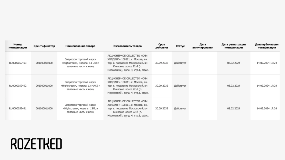 Нотификации для всех трёх устройств зарегистрированы 8 февраля 2024 года. Изготовителем значится АО «СМИ Холдинг». Mobiltelefon.ru полагает, что это юрлицо компании «Суверенная мобильная инициатива», созданной основателем Национальной компьютерной корпорации (НКК) Александром Калининым.