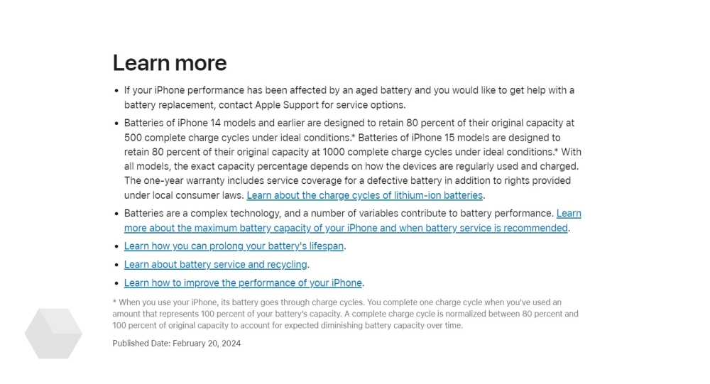 Для серии iPhone 14 и более ранних моделей пока ничего не изменилось в этом плане. Для этих смартфонов на сайте Apple заявлены всё те же 500 циклов. Однако это может измениться, поскольку компания начала изучать и более старые модели iPhone. В перспективе оценка долговечности аккумуляторов может быть пересмотрена и для прошлых поколений.