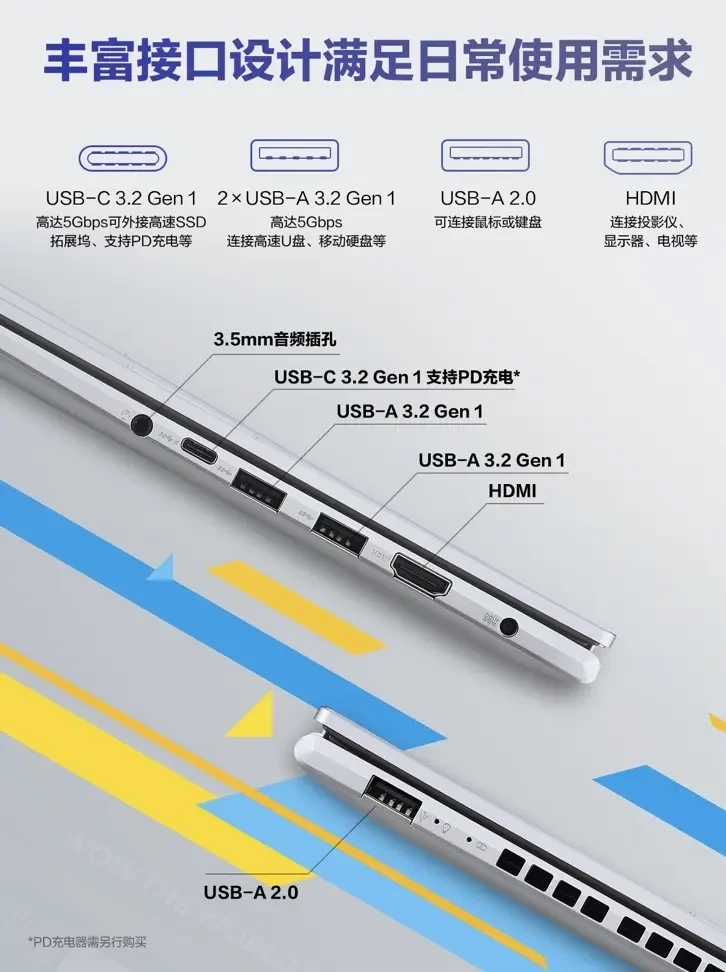 Порты: USB-C 3.2 Gen 1, USB-A 3.2 Gen 1, USB-A 2.0, HDMI и 3,5 мм. У лэптопа довольно большой тачпад, поддерживающий мультитач-жесты и есть антибактериальное покрытие на поверхностях клавиш. Система микрофонов с шумоподавлением на базе ИИ прилагается.