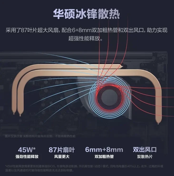 Аппаратной базой стал 12-ядерный и 16-поточный процессор Intel Core i5-13500H с TDP 45 Вт. Ноутбук оснащён 16 ГБ двухканальной ОЗУ с возможностью расширения и твердотельным накопителем PCIe 4.0 NVMe ёмкостью 1 ТБ. Отводом тепла от комплектующих занимается система охлаждения Asus Ice Blade. Ноутбук прошёл испытания и получил сертификат MIL-STD 810H.