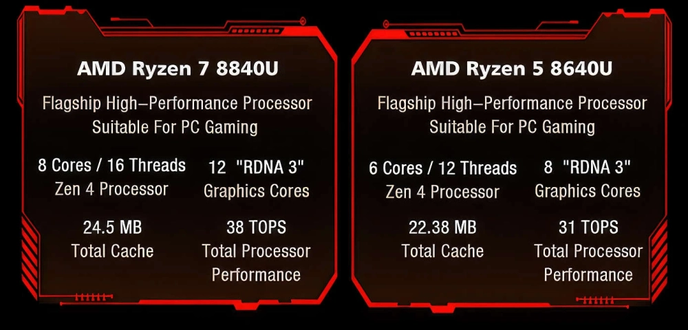 Главные изменения произошли внутри. Новинка базируется на 8-ядерном процессоре Ryzen 7 8840U или 6-ядерном Ryzen 5 8640U. Оба представляют собой решения на 4-нм архитектуре Zen4 и оснащаются улучшенным ИИ-модулем AMD XDNA. Насколько он будет полезен в играх, большой вопрос.