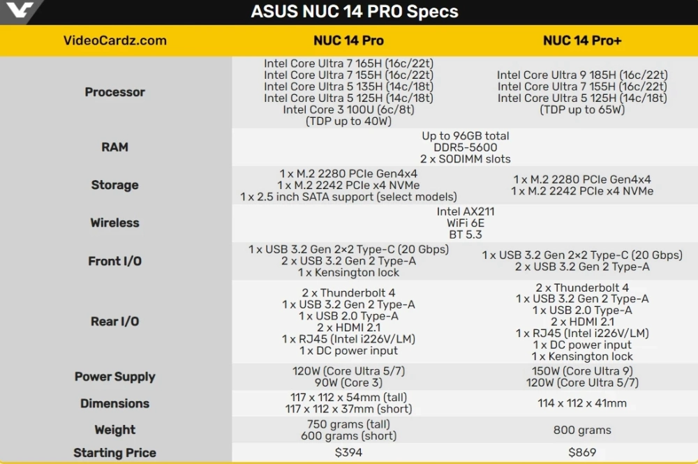 Компьютеры отличаются процессором и ценой. В минимальной конфигурации NUC 14 Pro стоит Core 3 100U, а в максимальной можно увидеть Core Ultra 7 165H. У Pro-версии минимум Core Ultra 5 125H, максимум — Core Ultra 9 185H. В оба компьютера можно установить до 96 ГБ оперативной памяти DDR5-5600 и накопители M.2 2280 PCIe Gen4x4.