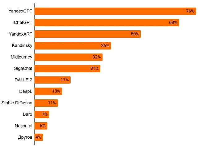 77% опрошенных используют нейросети как минимум несколько раз в месяц, а каждый десятый — ежедневно. Самая известная нейросеть — YandexGPT. На втором месте — ChatGPT, на третьем — YandexART.