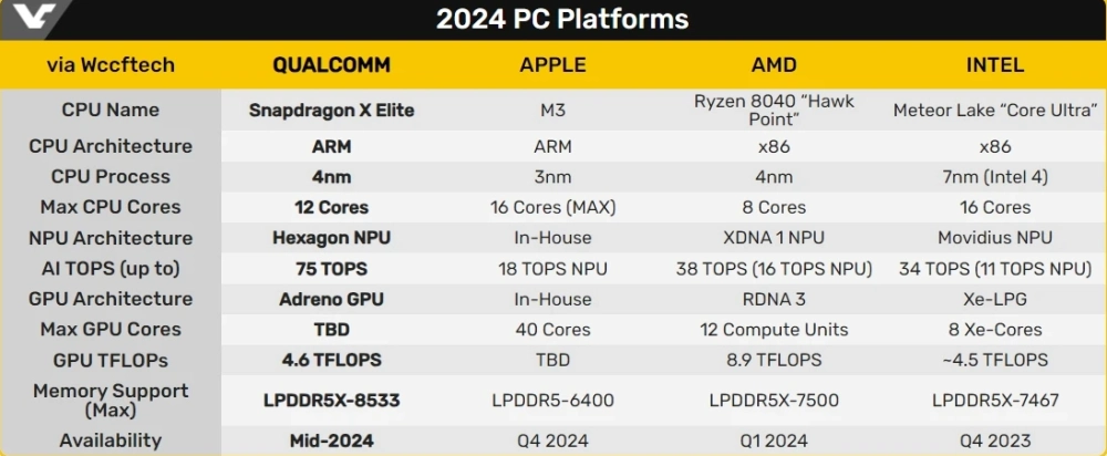 По данным Qualcomm, новая серия ARM-процессоров будет использовать 4-нм техпроцесс TSMC. Snapdragon X Elite будут поставляться с 12 ядрами, а тактовая частота составит до 4,3 ГГц. Также для чипов заявлена поддержка оперативной памяти LPDDR5X-8533 до 64 ГБ, твердотельные накопители PCIe Gen4, Wi-Fi7 или Bluetooth 5.3.