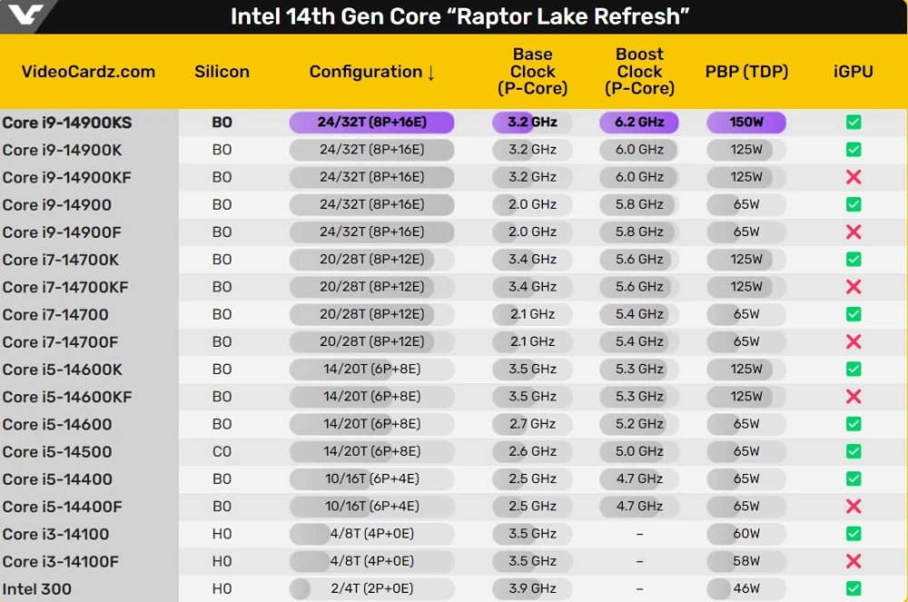 Intel Core i9-14900KS получил 24 ядра, как и обычный Core i9-14900K. Главное отличие — повышенная до 6,2 ГГц максимальная частота. Вместе с тем выросло и энергопотребление.