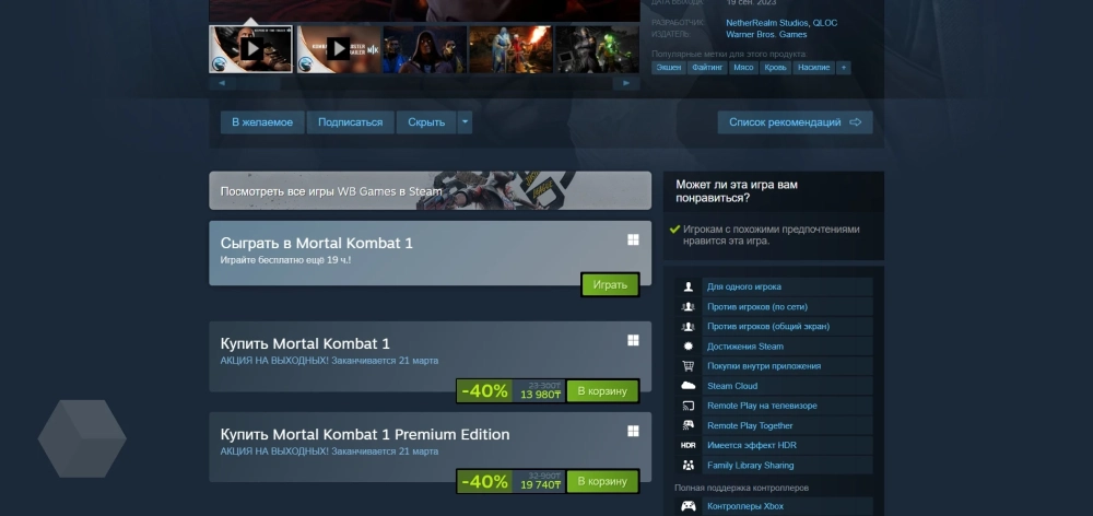 Кроме того, до 21 марта Mortal Kombat 1 можно купить со скидкой в 40% — как обычную версию, так и Premium Edition.