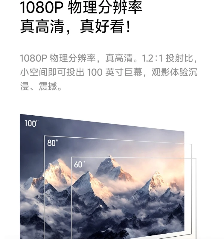 Redmi Projector Lite показывает картинку в разрешении 1080p при соотношении 1,2:1. Можно получить диагональ изображения до 100 дюймов. Яркость у проектора 150 CVIA люмен. Устройство сертифицировано SGS на низкое излучение синего света, что помогает снизить нагрузку на глаза.