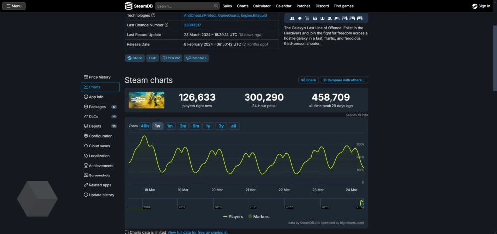 В список, помимо прочих, попала Helldivers 2, что ожидаемо. Кооперативный экшен стал одним из самых успешных релизов начала 2024 года. Игра вышла 8 февраля и с тех пор пиковый онлайн достиг почти 460 000 геймеров.