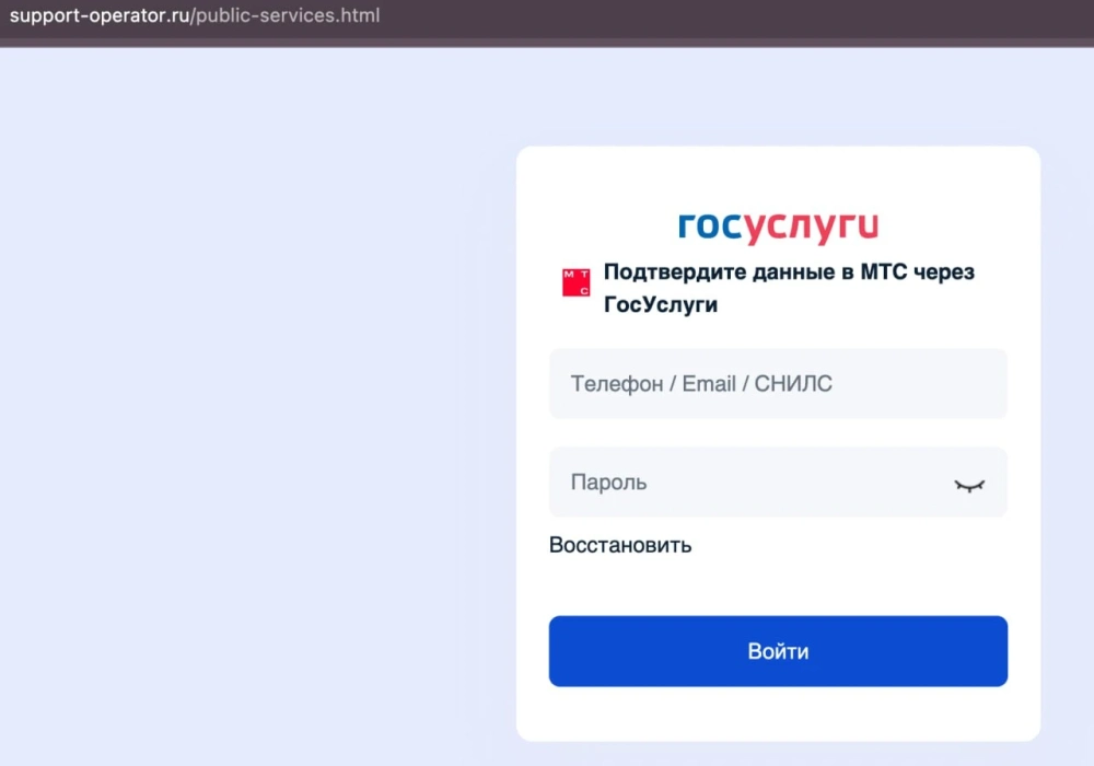 Потом пользователя перенаправляют на фейковую страницу входа в «Госуслуги». Там нужно ввести логин и пароль. Когда жертва вводит свои данные, мошенники получают доступ к личному кабинету.