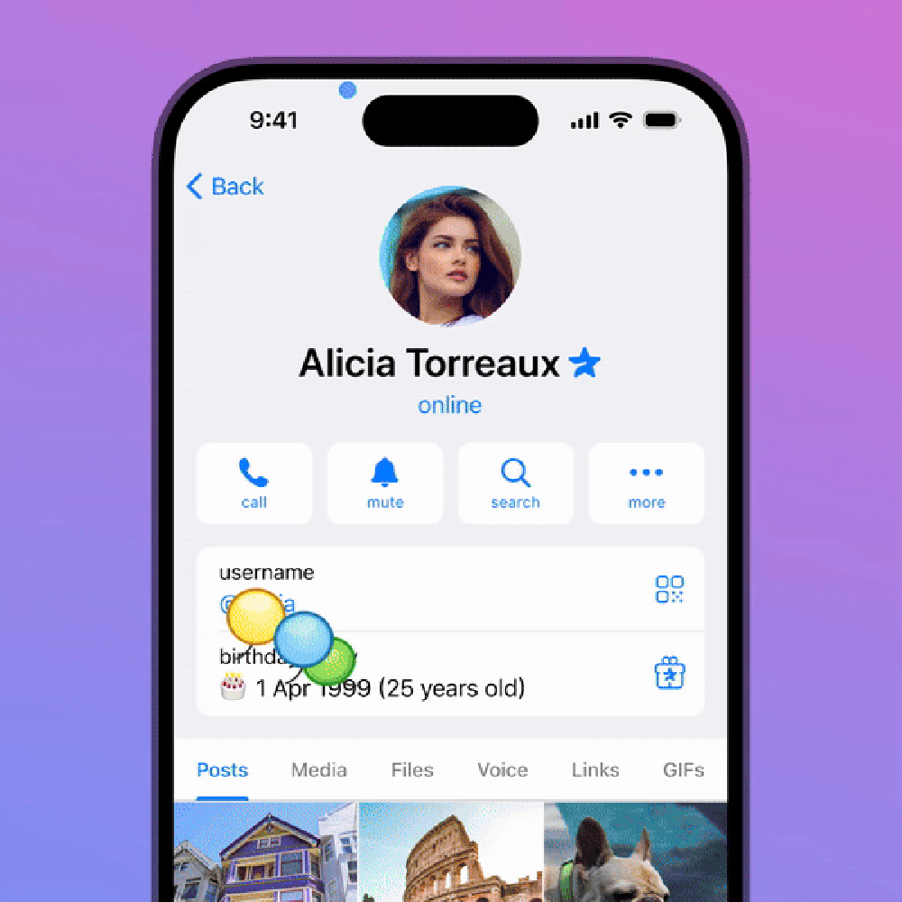 Дни рождения. Их можно указать в настройках профиля. Другие пользователи узнают о вашем Дне рождения, и Telegram предложит подарить подписку Premium. Каждый, кто откроет ваш профиль, увидит анимацию из воздушных шариков и конфетти.