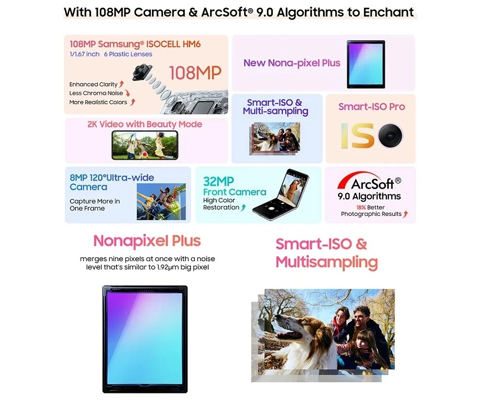 - Камера: 108 Мп (основная), 8 Мп (ширик); 32 Мп (фронтальная)