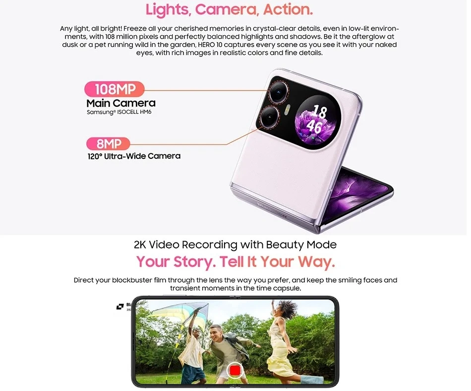 Если углубиться в характеристики, то окажется, что шарнир рассчитан на 250 000 складываний. Петля может удерживать экран под углом 30° и 150°. В основной камере используется 1/1,67-дюймовый сенсор Samsung ISOCELL HM6. У ширика угол обзора 120°.