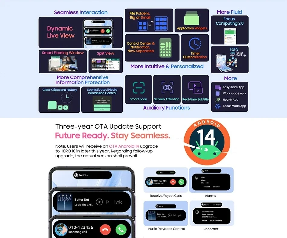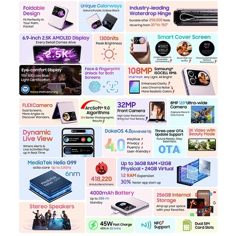 Смартфон поддерживает только сети 4G. Заявлены три года обновлений OC. За 20 минут батарейку можно зарядить почти на 50%. Есть стереодинамики, NFC и слот для двух SIM-карт. Корпус телефона выполнен из алюминиевого сплава, а задняя часть покрыта экокожей.