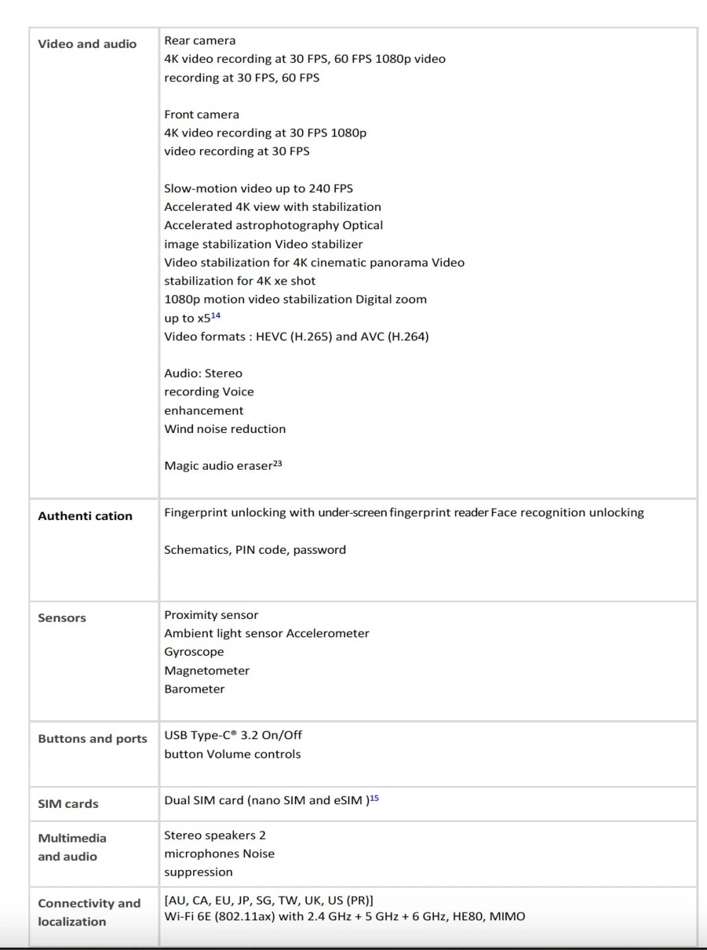 - Связь: USB 3.2 Type-С, Wi-Fi 6E, Bluetooth 5.3 GPS, 5G, A-GPS, Beidou, ГЛОНАСС, Galileo, NFC