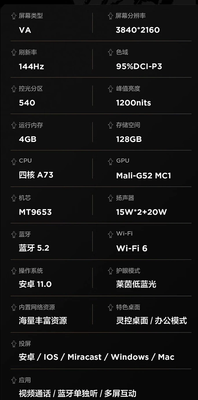 Что касается начинки, внутри стоит процессор MediaTek MT9653, дополненный 4 ГБ оперативной памяти и накопителем на 128 ГБ. Поддерживается беспроводной выход в интернет по Wi-Fi 6. Есть модуль Bluetooth 5.2. Порты: HDMI 2.1, HDMI 2.0, USB-A 3.0, USB-A 2.0, RJ45.