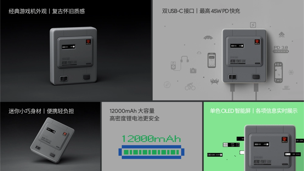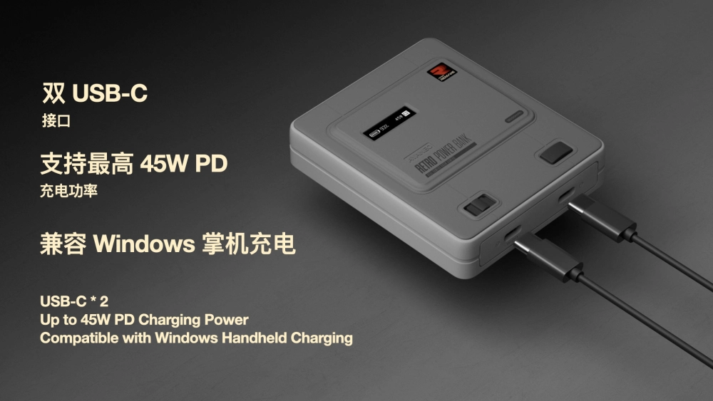 Внешний аккумулятор в виде классической приставки SNES. Ёмкость — 12 000 мАч. Поддерживается зарядка мощностью 45 Вт. Есть два порта USB-C и небольшой OLED-экран для отображения заряда аккумулятора.