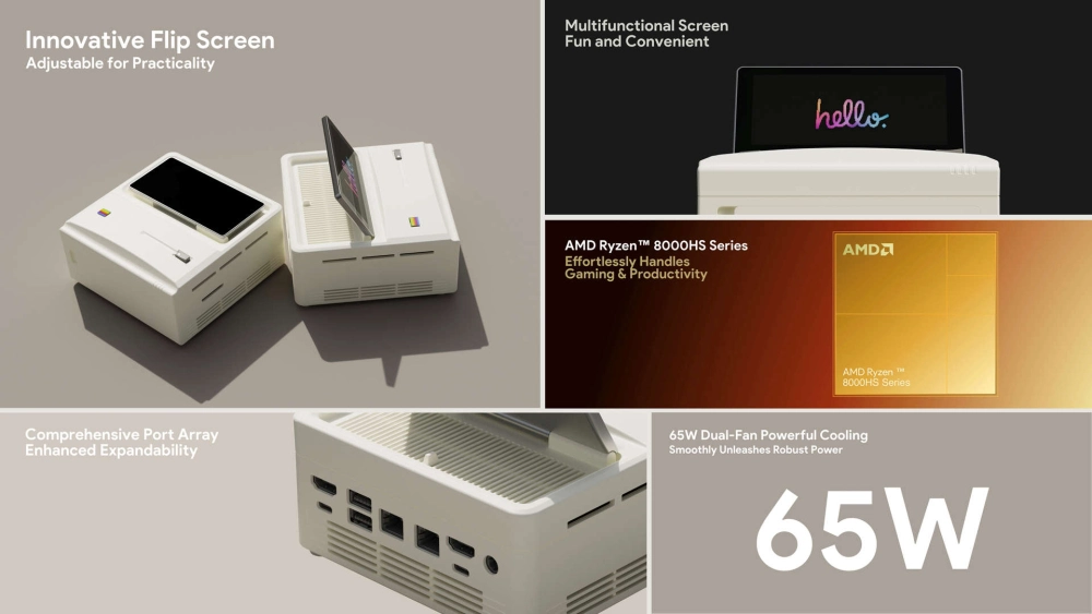 Начинку тоже обновили, причём мощно! Если в AM01 используются устаревшие процессоры Ryzen 3 3200U и Ryzen 7 5700U, то в новой версии актуальные 8-ядерники Ryzen 7 8845HS и Ryzen 9 8945HS с графикой RDNA 3.