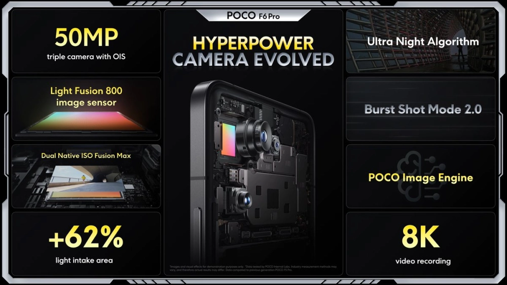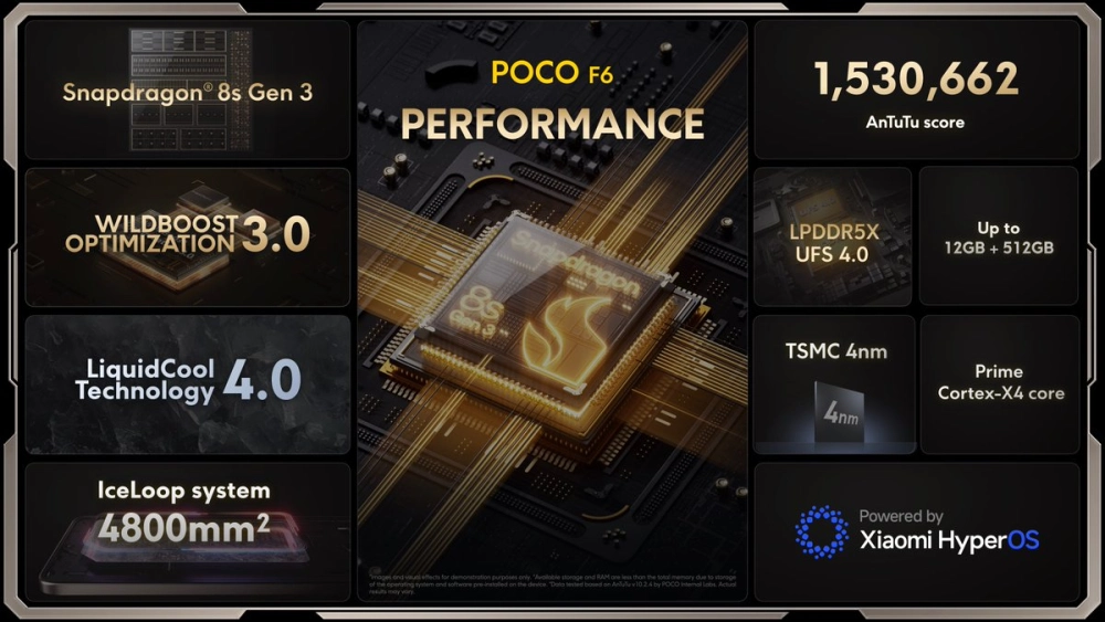 Poco F6. Поставляется со свеженьким процессором Snapdragon 8s Gen 3, 8/12 ГБ оперативной памяти LPDDR5X и хранилищем UFS 4.0 на 256/512 ГБ.