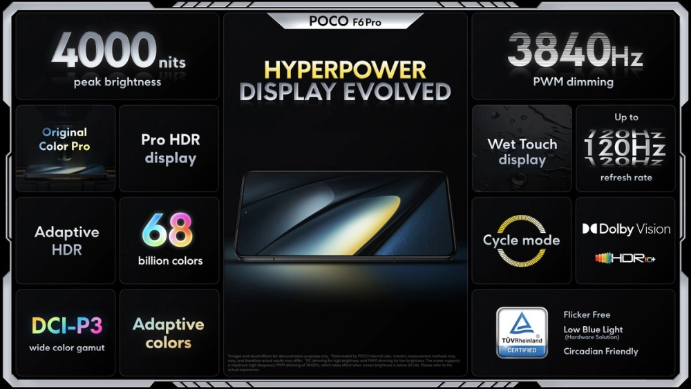 Экран: 6,67 дюйма, OLED, 1,5K, 120 Гц, 100% DCI-P3, Dolby Vision, до 2400 нит, ШИМ 1920 Гц. Корпус с защитой от воды и пыли IP64. Стекло Gorilla Glass Victus установлено на экране.