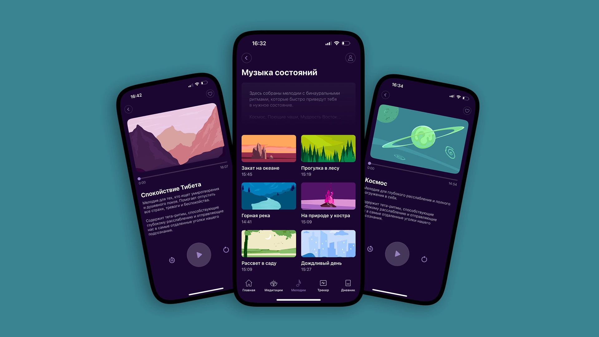 В «Потоке» есть четыре основных раздела: «Медитации», «Мелодии», «Трекер» и «Дневник». Первый включает в себя десять коротких медитаций длительностью по 15 минут, чтобы быстро успокоиться и вернуть продуктивность. Второй, как и следует из названия, содержит мелодии, в том числе с бинауральными ритмами и для здорового сна.