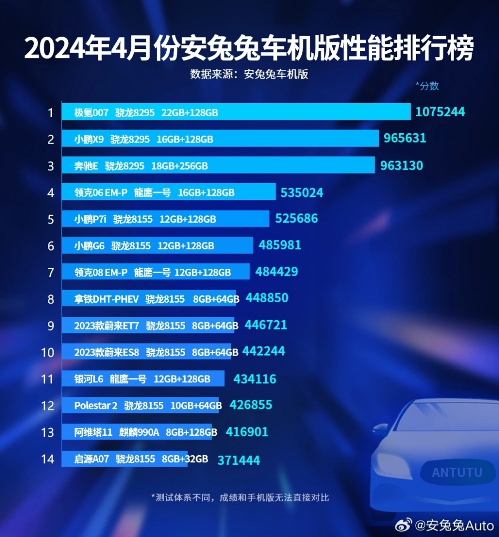 AnTuTu также опубликовал рейтинг производительности бортовых компьютеров автомобилей за апрель 2024 года. На первом месте оказался Zeekr 007 — его компьютер набрал чуть больше 1 млн баллов. Далее идёт Xpeng X9, а замыкает топ-3 Mercedes-Benz E.
