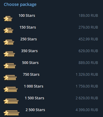 Приобрести «Звёзды» можно через систему встроенных покупок в App Store и Google Play, а также при помощи бота PremiumBot. Внутренняя валюта была нужна для того, чтобы соответствовать правилам магазинов приложений, так как ранее работавшая система оплаты нарушала их. Стоимость в рублях следующая.