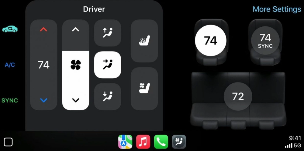В CarPlay появились три новых приложения: Vehicle, Media и Climate. Последнее позволяет выставлять настройки климата в салоне. Кроме того, у пользователя будет возможность посмотреть картинку с задней камеры, активировать подогрев сидений, проверить давление в колёсах и не только. Также система будет оповещать уведомлениями о статусе заряда аккумулятора в электрических машинах и об появлении доступных обновлений.