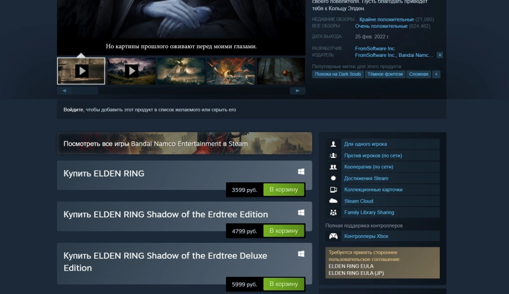 Elden Ring и дополнение для неё продаются и в российском сегменте Steam, но там нужно заморачиваться с оплатой. Что касается цен — Standard Edition в магазине Valve продаётся за 3599 рублей, а у Shadow of the Erdtree Edition и Deluxe Edition ценники как в VK Play.