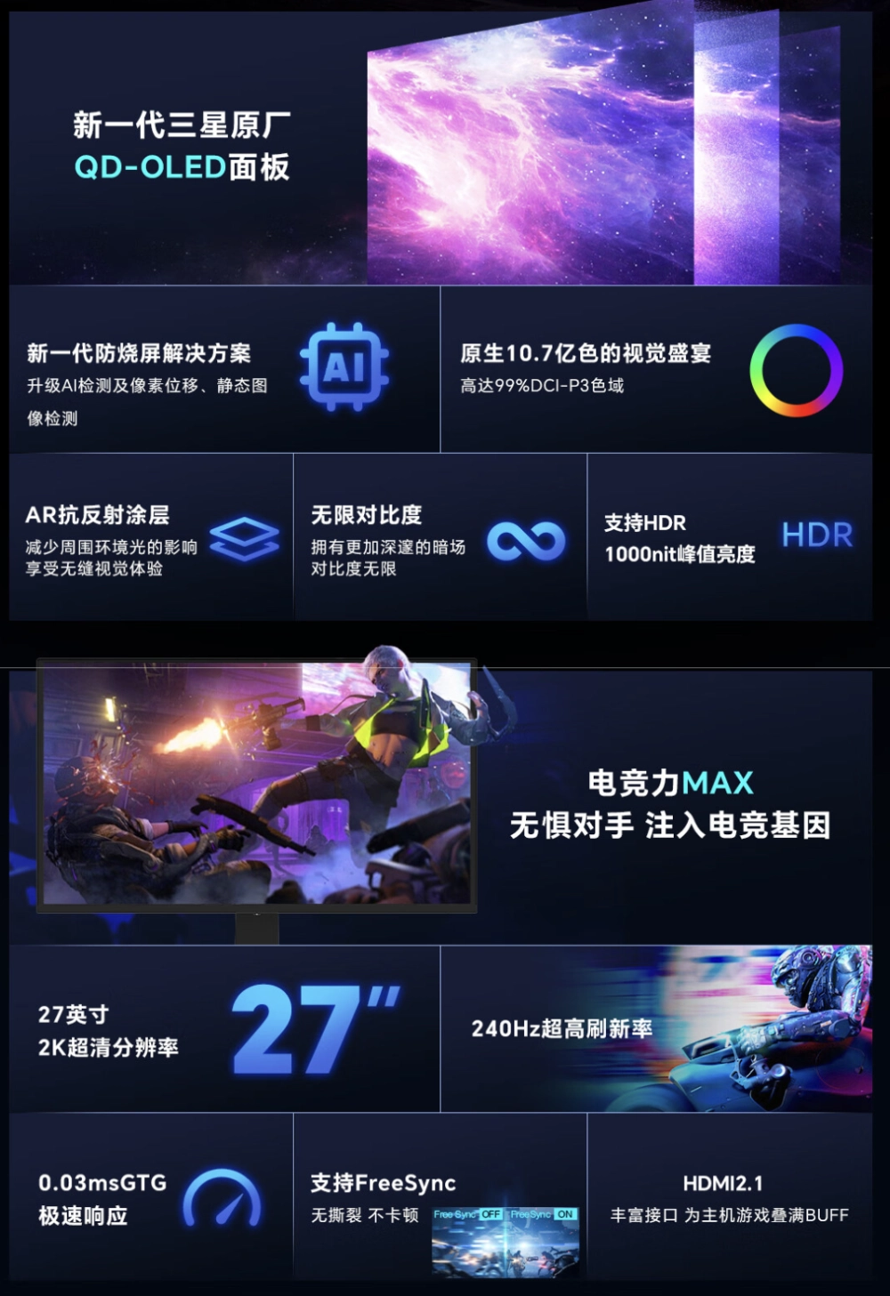 Монитор поставляется с экраном QD-OLED на 26,5 дюйма. Картинка отображается в разрешении 2560×1440 пикселей при кадровой частоте 240 Гц. У OLED-матриц обычно быстрое время отклика, и дисплей DQ27F240E не стал исключением — 0,03 мс. Пиковая яркость — 1000 нит. Монитор способен отобразить 99% цветовой гаммы DCI-P3.
