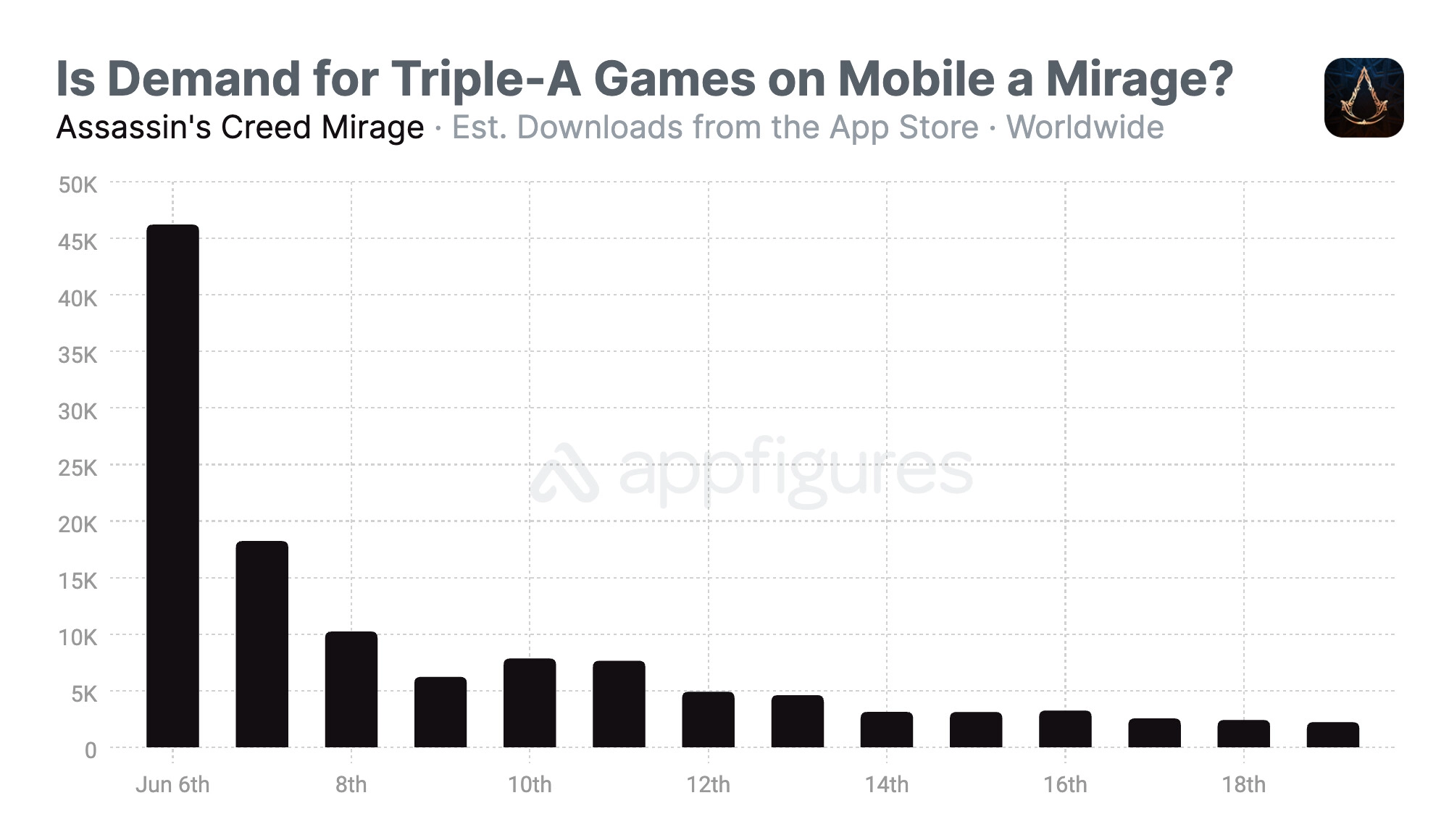 Согласно данным сервиса Appfigures, с момента выхода Assassin's Creed Mirage в июне 2024 года, полную версию игры купили не более трёх тысяч пользователей. При цене игры в 50 долларов (~4400 рублей) общая выручка составляет 138 тысяч долларов.