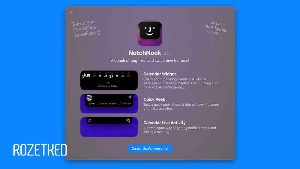 К тому же NotchNook работает и на Mac без выреза, главное требование — macOS 14.0 и новее. На таких компьютерах приложение просто находится в верхней части экрана в виде выреза или чёрной полоски. Все функции также доступны.