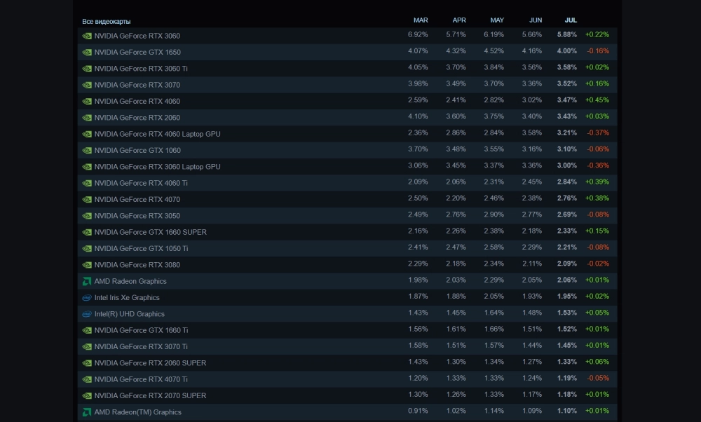 Valve обновила данные об оборудовании пользователей магазина Steam. По состоянию на июль 2024 года самой популярной видеокартой среди геймеров остаётся GeForce RTX 3060.